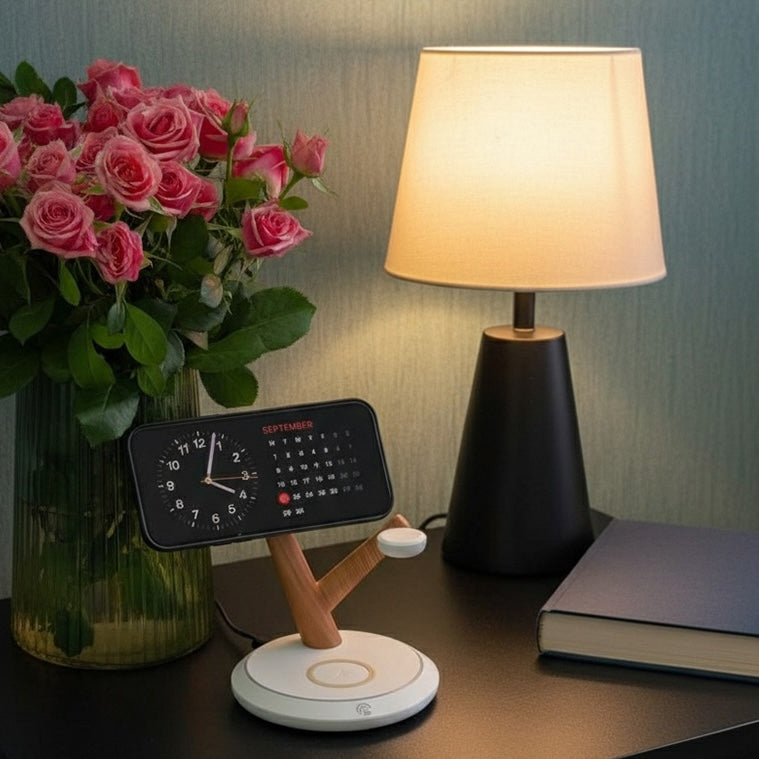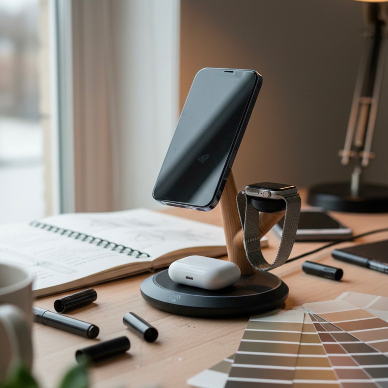 Charges everything quickly phone hits full by morning earbuds top off too watch stays secure though I’d love if they offered more finish colors to match different room styles