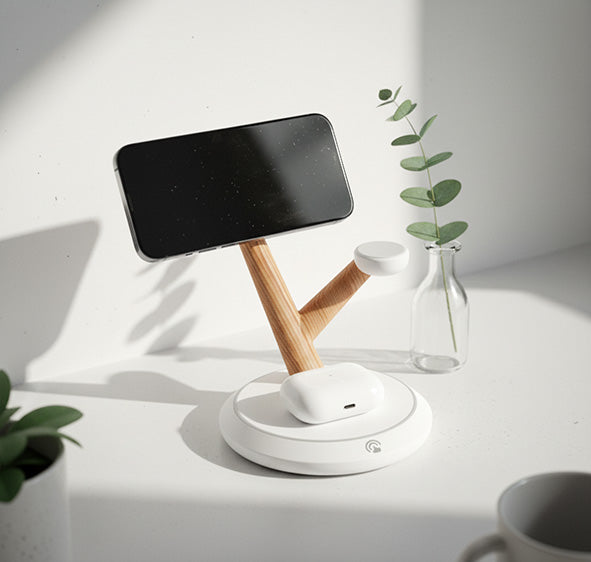 This stand really cleaned up my messy desk before I had wires everywhere now everything is in one compact charger though it’d be better if the phone arm rotated more