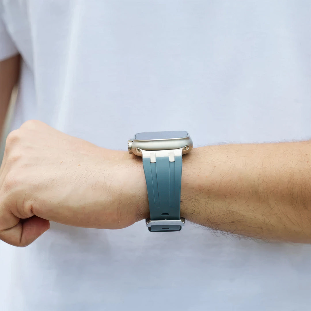 Your Apple Watch deserves a band that combines style and protection. With this, you don’t have to sacrifice comfort for a sleek look. This band hugs your wrist in soft silicone, keeping you comfy all day long. Keep your watch safe and stay stylish effortlessly!