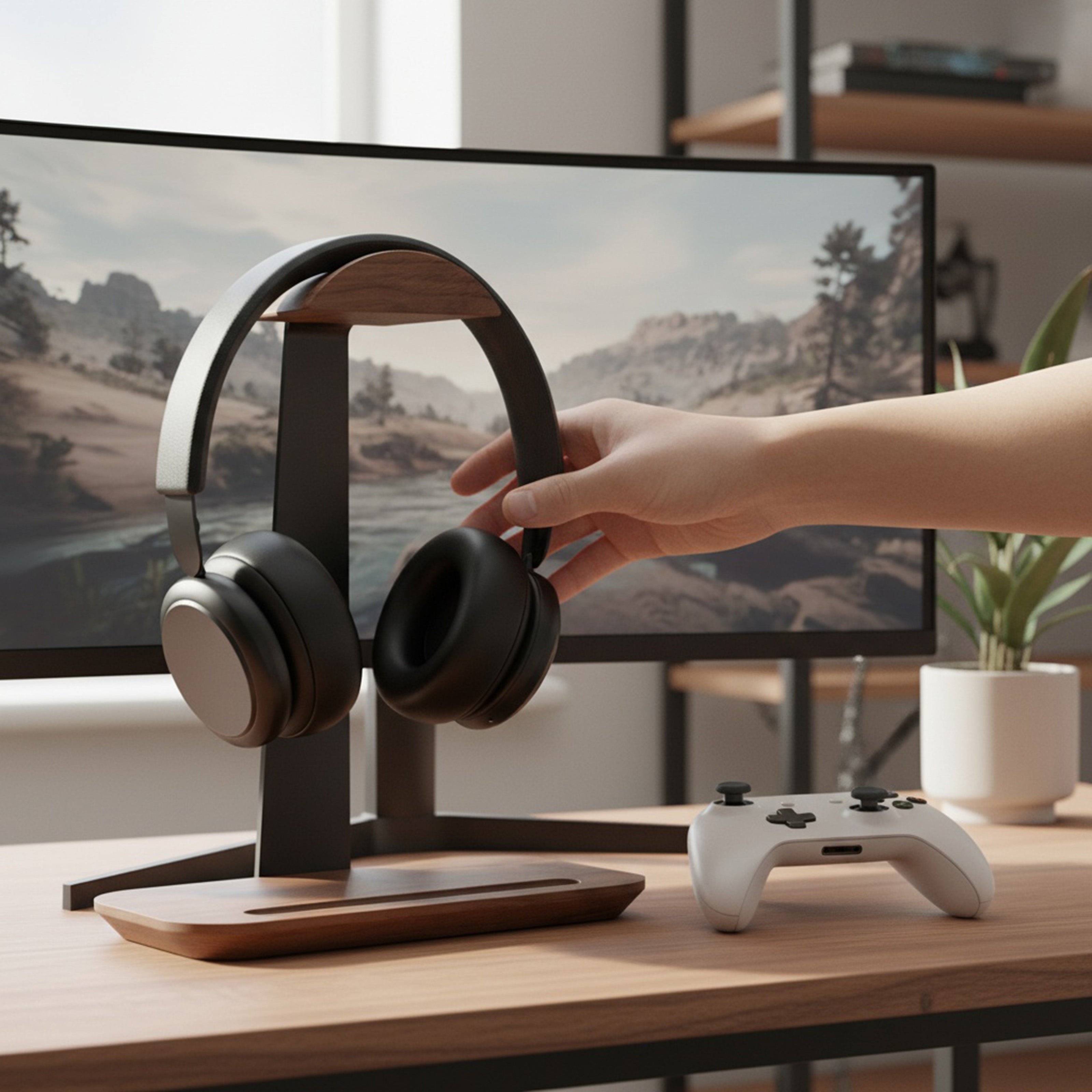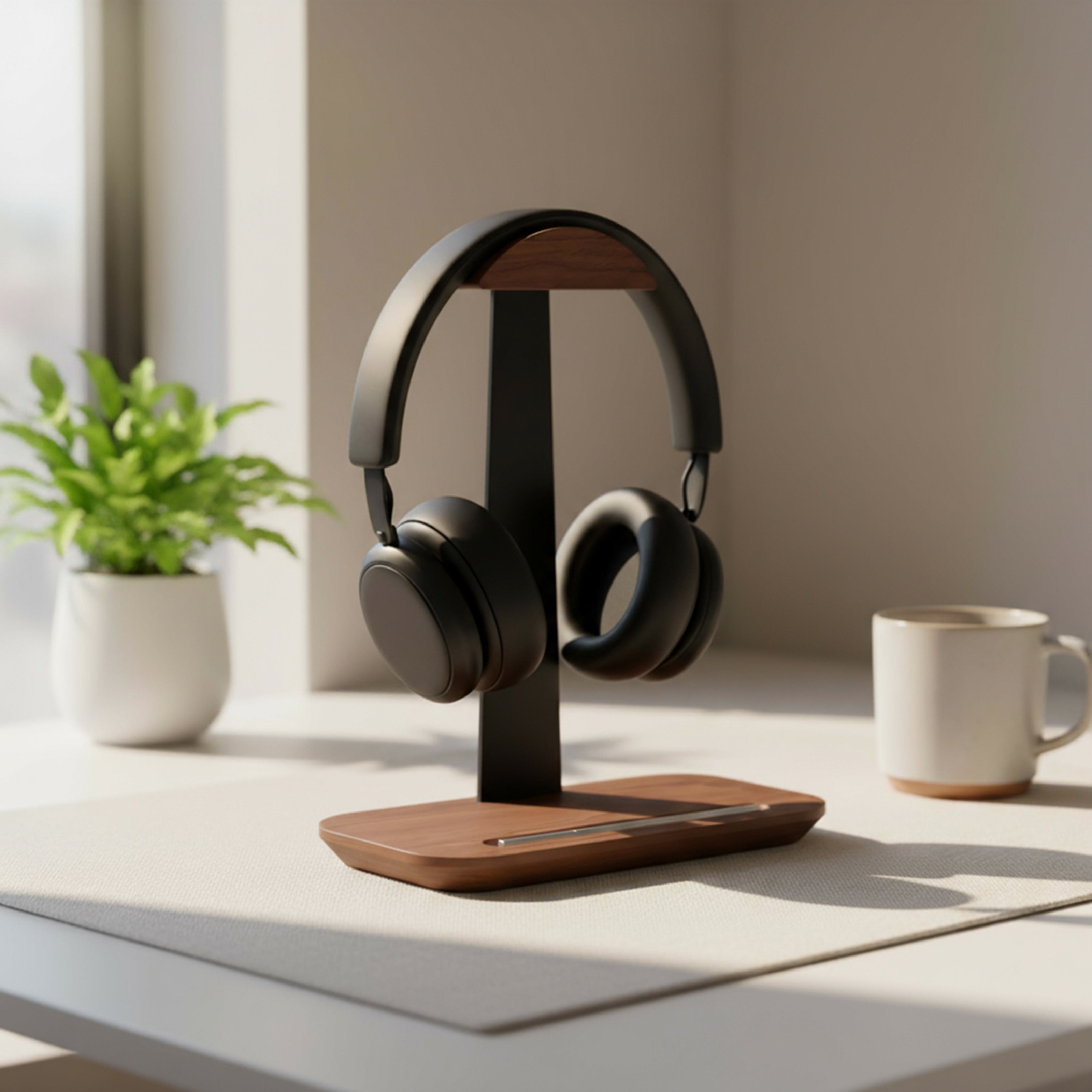 The walnut finish paired with minimalist aluminum turns a simple desk into a styled environment. Instead of hiding your headset, you’ll want it front and center. Friends, coworkers, or clients notice the difference — your workspace speaks of taste, not mess.